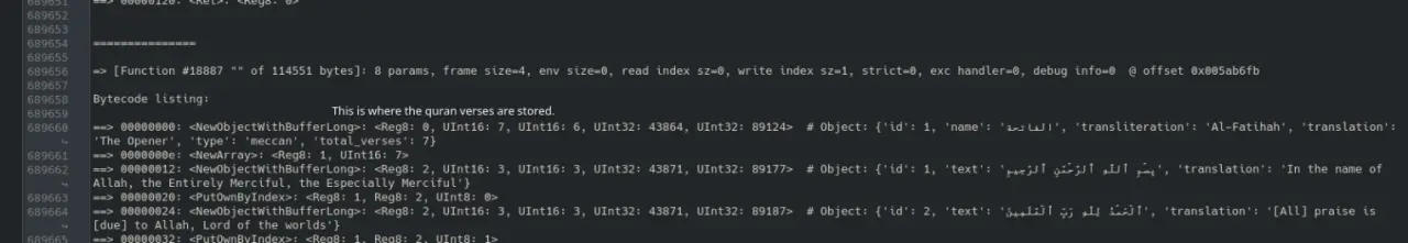 This is where the quran verses are stored. ==> 00000000: <NewObjectWithBufferLong> <Reg8: 0, UInt16: 7, UInt16: 6, UInt32: 43064, UInt32: 8912> # Object: { 'id': 1, 'name': '....', 'transliteration': 'Al-Fatihah', 'translation': 'The Opener', 'type': 'meccan', 'total_verses': 7 }