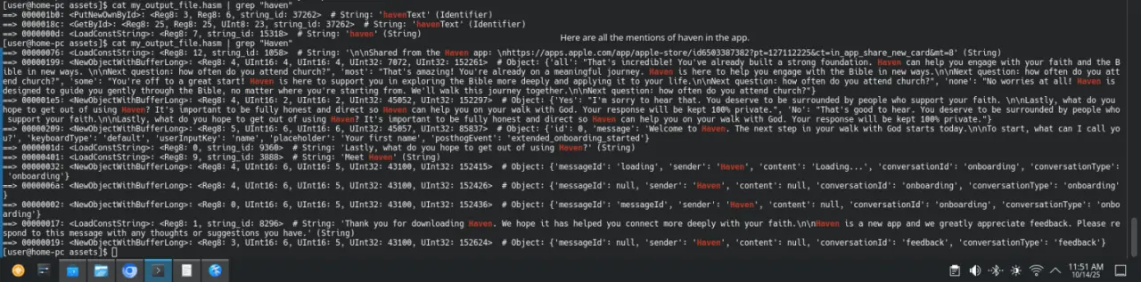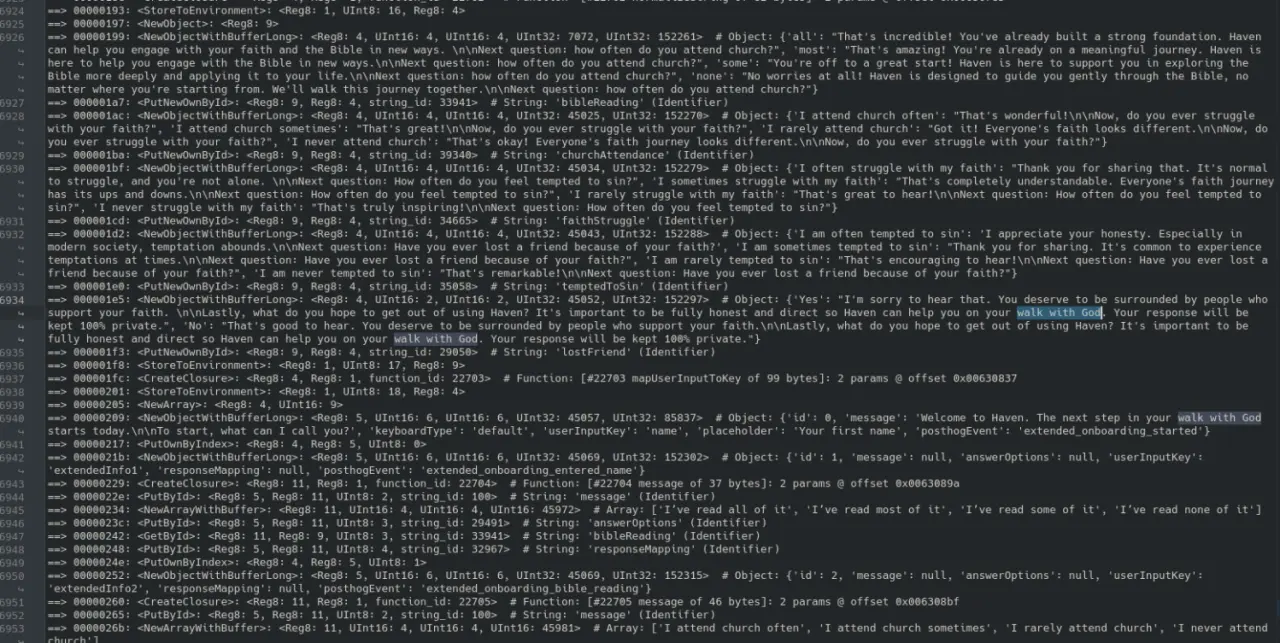 - Quranic Data Source: While the app contains Christian-themed code, it pulls its Quranic data from the code. The disassembled code shows objects containing Quran verses in Arabic, along with transliteration and English translations. The structure suggests this data is loaded into the pre-existing framework of the “Haven” app.