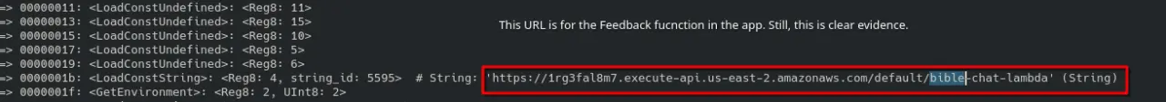 - “Bible Chat” API Endpoint: A hardcoded URL for a feedback function points to an Amazon Web Services (AWS) Lambda function named