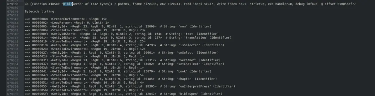 assets/directory asindex.android.bundle. This file is the compiled JavaScript code for a React Native application. - Disassembly of Hermes Bytecode: The