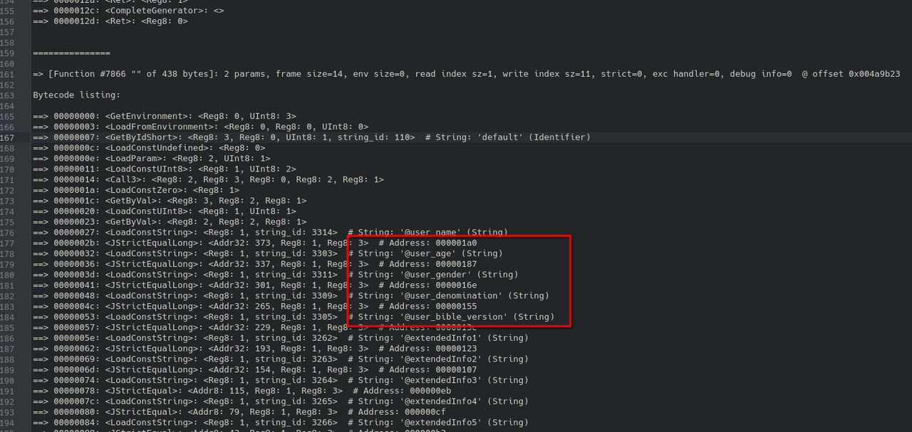 index.android.bundlewas disassembled using specialized tools to convert the machine-readable code into a human-readable assembly format (.hasm). This allows for the inspection of the application’s functions, variables, and embedded text strings.